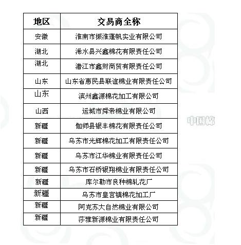 2011年度臨時(shí)收儲(chǔ)第三十四批已審核交易商來(lái)自全國(guó)5個(gè)主產(chǎn)區(qū),共計(jì)14家。詳細(xì)名單如下: