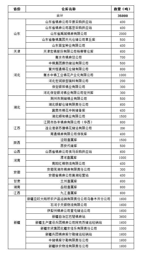 10月28日在以下指定倉庫收儲2011年度棉花35000噸。