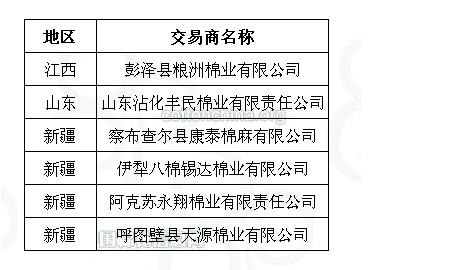 2011年度臨時收儲第四十九批已審核交易商來自全國3個主產(chǎn)區(qū),共計(jì)6家。詳細(xì)名單如下: