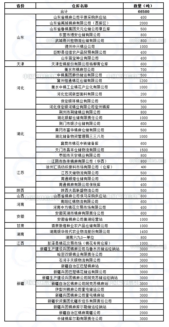 11月17日在以下指定倉庫收儲2011年度棉花66500噸