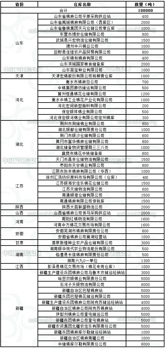 錦橋紡織網(wǎng)—資訊頻道> 棉花信息> 棉花動(dòng)態(tài)>正文 11月21日收儲(chǔ)庫(kù)點(diǎn)及數(shù)量