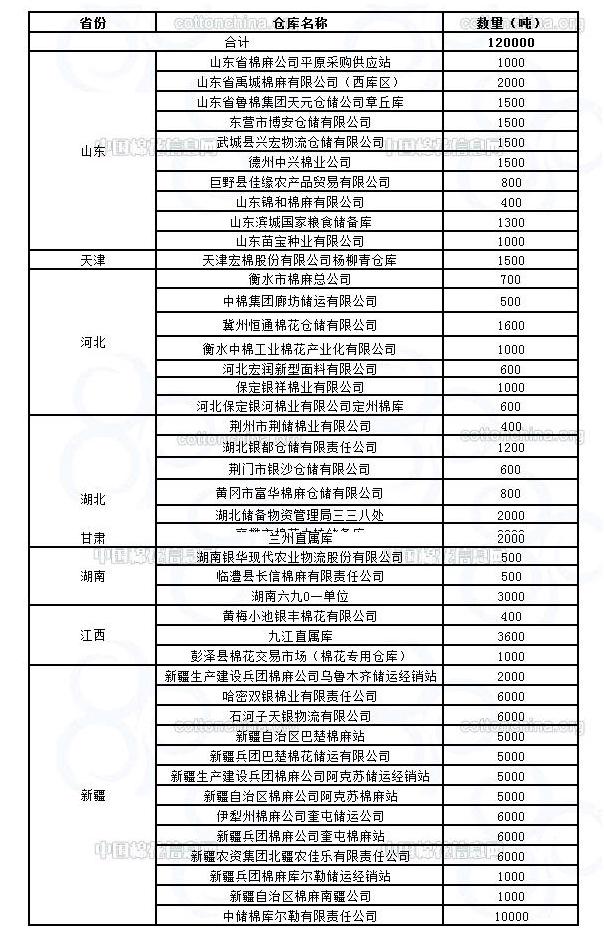 錦橋紡織網(wǎng)—資訊頻道> 棉花信息> 棉花動(dòng)態(tài)>正文 11月23日收儲(chǔ)庫(kù)點(diǎn)及數(shù)量