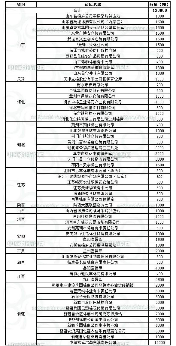 錦橋紡織網(wǎng)—資訊頻道> 棉花信息> 棉花動(dòng)態(tài)>正文 11月28日收儲(chǔ)庫點(diǎn)及數(shù)量