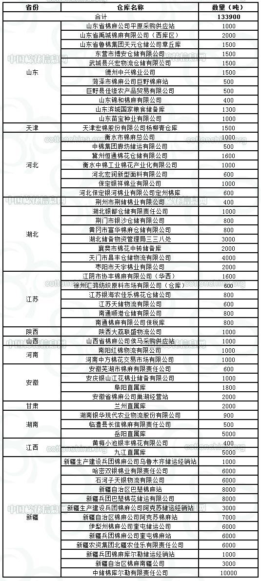 11月29日在以下指定倉庫收儲2011年度棉花133900噸
