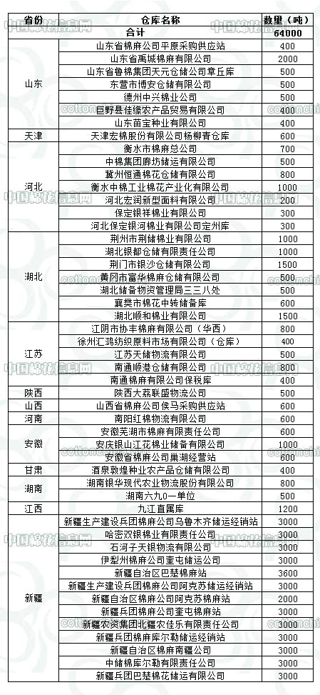 錦橋紡織網(wǎng)—資訊頻道> 棉花信息> 棉花動(dòng)態(tài)>正文 11月3日收儲庫點(diǎn)及數(shù)量