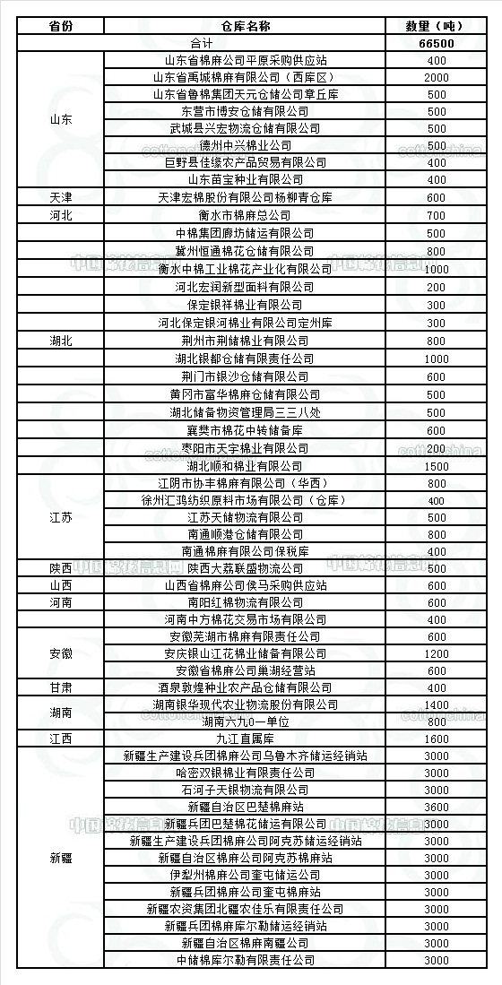 錦橋紡織網(wǎng)—資訊頻道> 棉花信息> 棉花動(dòng)態(tài)>正文 11月7日收儲(chǔ)庫(kù)點(diǎn)及數(shù)量