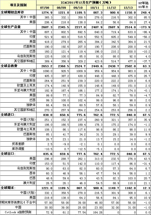 國際棉花咨詢委員會12月份全球棉花產銷預測報告:與11月份預測報告比較,11/12年度的消費量和期末庫存量略做調整。即全球消費量調減21萬噸(其中中國調減4萬噸,印度調減14萬噸);全球年末庫存量調增21萬噸。報告對下年度(12/13年度)棉花產消情況作了預測。預測12/13年度全球棉花產量將有所下降,消費、進、出口都將有不同程度增長,期末庫存微增。