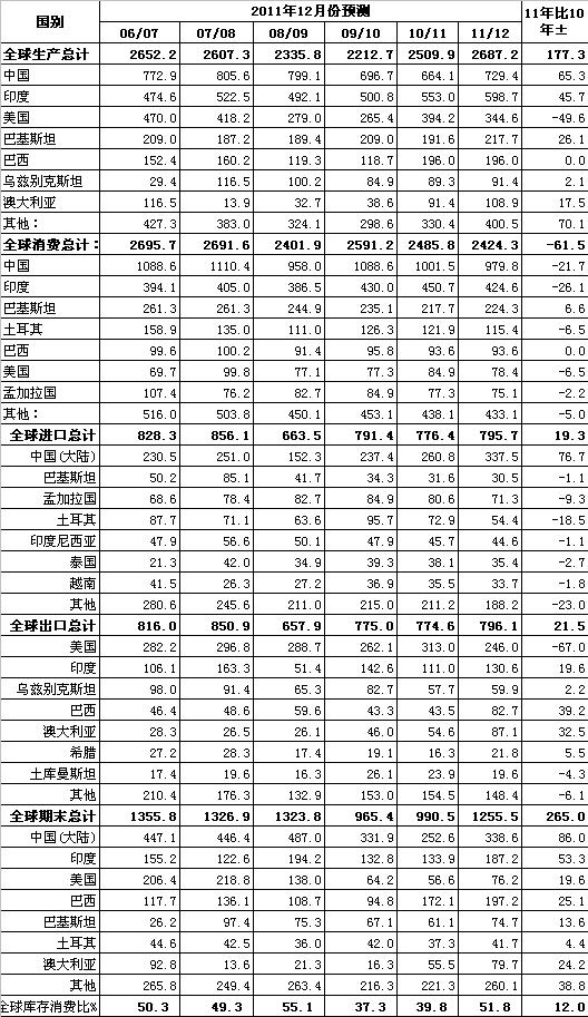 美國(guó)農(nóng)業(yè)12月預(yù)測(cè),2011/12年度,全球棉花生產(chǎn)量,進(jìn)、出口量及期末庫(kù)存量較上年度不同程度增加,消費(fèi)下降。預(yù)測(cè)中國(guó)三增一減,即生產(chǎn)量、進(jìn)口量、期末庫(kù)存量增加,消費(fèi)較上年度減少。預(yù)測(cè)美國(guó)除期末庫(kù)存增加外,其他指標(biāo)均全線下降。印度生產(chǎn)、出口、庫(kù)存增加,消費(fèi)較大幅度下降。 2011/12年度,全球棉花生產(chǎn)2687萬(wàn)噸(較11月份預(yù)測(cè)值調(diào)低10萬(wàn)噸,主要是調(diào)減美國(guó)產(chǎn)量),創(chuàng)歷史新高,同比上年度增加177萬(wàn)噸,增幅7.1%。其中中國(guó)729萬(wàn)噸,增加65萬(wàn)噸,增幅9.8%;印度增加46萬(wàn)噸,增幅8.3%;巴基斯坦增加26萬(wàn)噸,增幅13.6%;澳大利亞增加17.5萬(wàn)噸,增幅19.2%。其他地區(qū)增加70萬(wàn)噸,增幅21.2%。2011/12年度,全球消費(fèi)2424萬(wàn)噸(比11月份預(yù)測(cè)值調(diào)減63萬(wàn)噸,其中中國(guó)和土耳其各調(diào)減10萬(wàn)噸,印度調(diào)減21萬(wàn)噸),同比上年度減少61萬(wàn)噸,減幅2.5%。其中印度減少26萬(wàn)噸,下降5.8%;中國(guó)減少22萬(wàn)噸,下降2.2%;美國(guó)和土耳其增調(diào)減6.5萬(wàn)噸,分別下降7.7%和5.3%;巴基斯坦增加6萬(wàn)噸,增幅3%。 2011/12年度,全球棉花進(jìn)口796萬(wàn)噸(比11月份預(yù)測(cè)值調(diào)增5萬(wàn)噸,其中中國(guó)調(diào)增32萬(wàn)噸,土耳其調(diào)減13萬(wàn)噸),同比上年度增加19萬(wàn)噸,增幅2.5%。預(yù)測(cè)中國(guó)進(jìn)口337萬(wàn)噸,比上年度增加77萬(wàn)噸,增幅29.4%,其他國(guó)家和地區(qū)均不同程度減少進(jìn)口。2011/12年度,全球棉花出口796萬(wàn)噸(比11月份調(diào)增5萬(wàn)噸,其中印度調(diào)增16萬(wàn)噸,澳大利亞調(diào)減4萬(wàn)噸),同比上年度增加21萬(wàn)噸,增幅2.8%。預(yù)測(cè)美國(guó)將減少出口67萬(wàn)噸,下降24.4%;巴西、澳大利亞、印度分別增加39、33和20萬(wàn)噸,分別比上年度增幅90.1%、59.5%和17.7%。 2011/12年度,由于全球棉花豐收,消費(fèi)下降,期末庫(kù)存將大幅增加。預(yù)測(cè)本年度末全球期末庫(kù)量達(dá)1255萬(wàn)噸(比11月預(yù)測(cè)值調(diào)增59萬(wàn)噸,其中中國(guó)調(diào)增43萬(wàn)噸,巴西和澳大利亞各調(diào)增4萬(wàn)噸,印度和巴基斯坦各調(diào)增2萬(wàn)噸),比上年度增加265萬(wàn)噸,增幅26.8%。其中中國(guó)和印度將增加庫(kù)存86和53萬(wàn)噸,同比增幅34.1%和39.8%;美國(guó)、巴西、澳大利亞等地區(qū)期末庫(kù)存量均比上年度有不同程度增加。