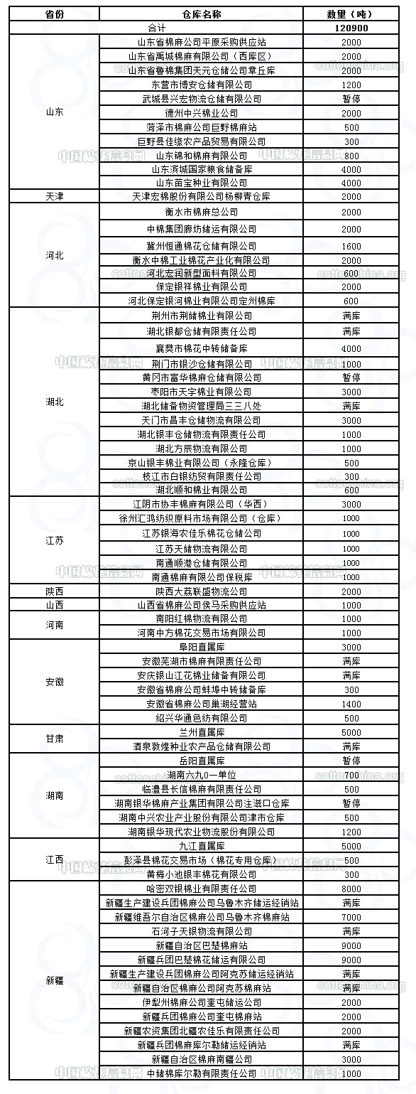 12月20日在以下指定倉庫收儲2011年度棉花120900噸。