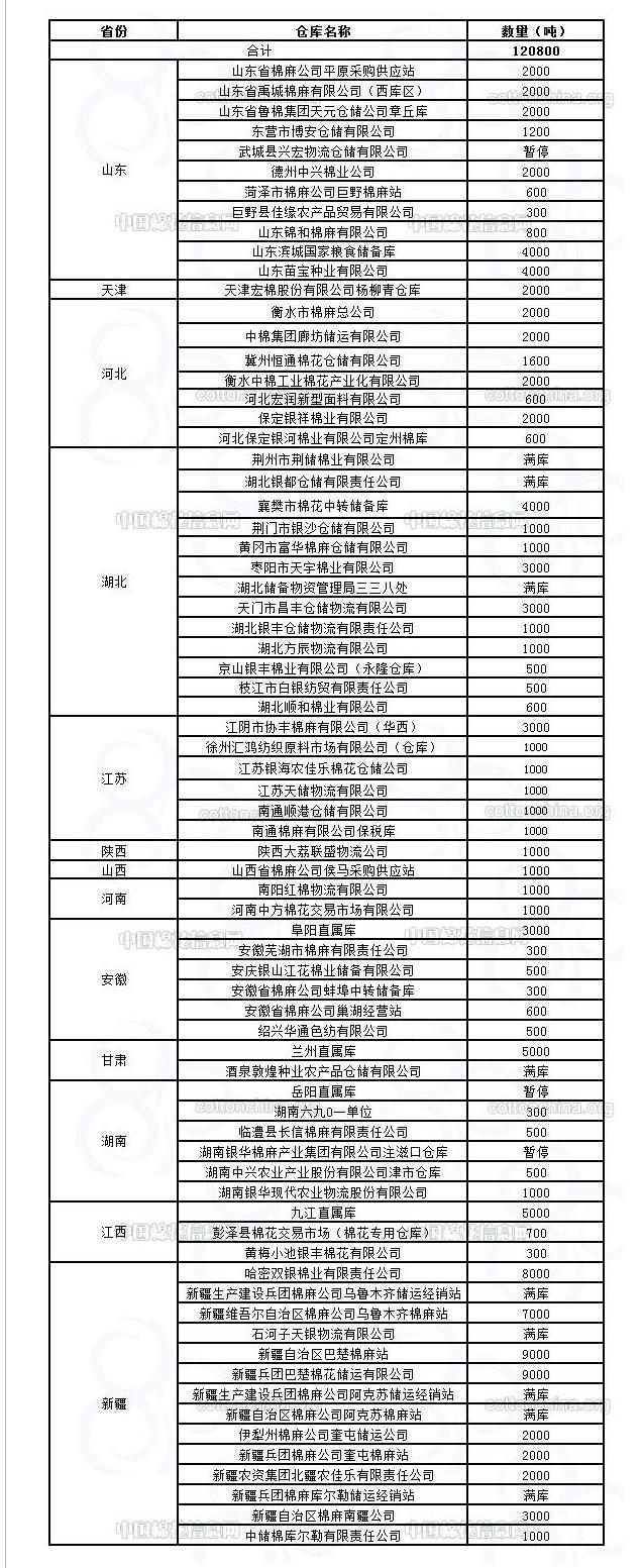 錦橋紡織網(wǎng)—資訊頻道> 棉花信息> 棉花動(dòng)態(tài)>正文 12月21日收儲(chǔ)庫點(diǎn)及數(shù)量