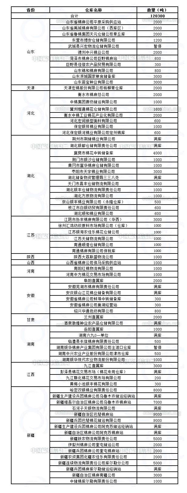 12月22日在以下指定倉(cāng)庫(kù)收儲(chǔ)2011年度棉花120300噸。
