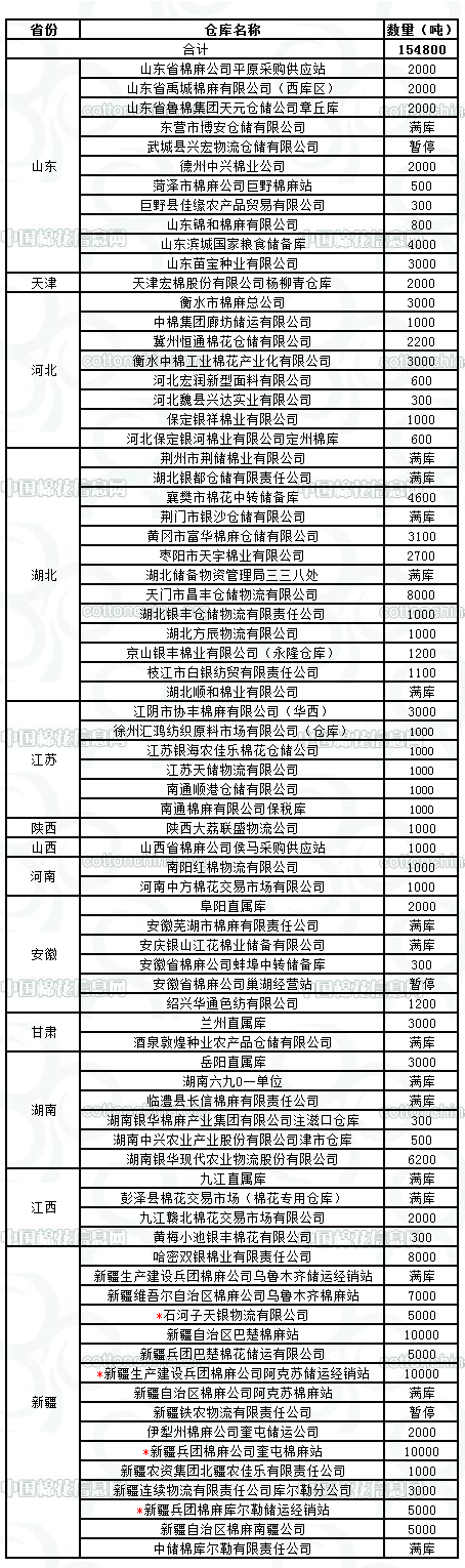 12月30日在以下指定倉庫收儲(chǔ)2011年度棉花154800噸。為了騰空庫容,解決兵團(tuán)企業(yè)交儲(chǔ)困難的問題,經(jīng)商國家有關(guān)部門同意,將新疆部分庫點(diǎn)的單筆合同由400噸調(diào)整為5000噸(具體見帶*庫點(diǎn))。