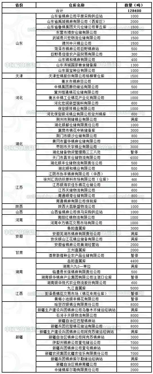 12月6日在以下指定倉庫收儲2011年度棉花128400噸,個別庫點因滿庫暫停收儲。