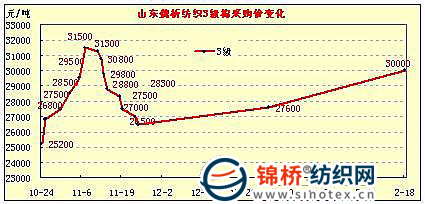 2月18日,山東某大型紡織集團(tuán)上調(diào)皮棉采購價(jià),其中2級皮棉采購價(jià)30200元/噸(送到、帶票、公重、現(xiàn)款,下同),3級30000元/噸,429級29700元/噸,427級29500元/噸,均較1月4日(春節(jié)前最后1次上調(diào)價(jià)格)上漲2400元/噸,不打算采購5級皮棉。