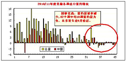 當(dāng)周中國(guó)凈簽約進(jìn)口本年度陸地棉負(fù)的2291噸(新簽約2654噸,由其它港口轉(zhuǎn)簽998噸,取消簽約5942噸);裝運(yùn)陸地棉14946噸及皮馬棉3016噸;凈簽約下年度陸地棉930噸。