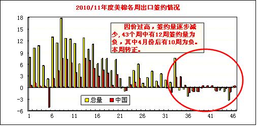 當周中國凈簽約本年度陸地棉4173噸,裝運陸地棉14311噸及皮馬棉567噸;另外凈簽約下年度陸地棉為負的907噸。