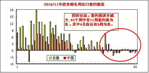 當(dāng)周中國(guó)凈簽約本年度陸地棉為負(fù)的3583噸(當(dāng)周沒有新簽約),裝運(yùn)13903噸;凈簽約本年度皮馬棉1338噸,裝運(yùn)249噸。