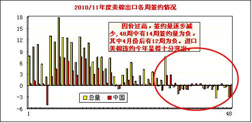 當(dāng)周中國凈簽約進(jìn)口本年度陸地棉負(fù)的31048噸(新簽約9457噸,來自其它港口159噸,取消40665噸),裝運陸地棉12020噸;凈簽約下年度陸地棉5987噸。