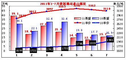 7月,進口棉花價格繼續(xù)回落,我國進口棉花數(shù)量回升。據(jù)海關(guān)統(tǒng)計,2011年7月我國進口棉花15.7萬噸,較6月增加3.7萬噸,增幅31%;較2010年同期減少7%;平均進口價格3110美元/噸,較6月下跌51美元,跌幅1.6%。 2011年前7個月累計進口棉花148萬噸,較去年同期下降13.4%;2010年度前11個月累計進口237萬噸,同比增長4.6%。 轉(zhuǎn)載本網(wǎng)專稿請注明:"本文轉(zhuǎn)自錦橋紡織網(wǎng)" |