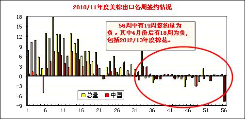 凈簽約下年度(12/13年度)陸地棉的有中國(84822噸)、和土耳其(2994噸)。凈簽約皮馬棉為中國(204噸)。