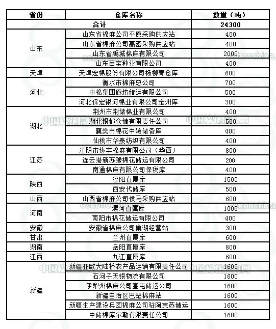 9月9日在以下指定倉庫收儲2011年度棉花24300噸。