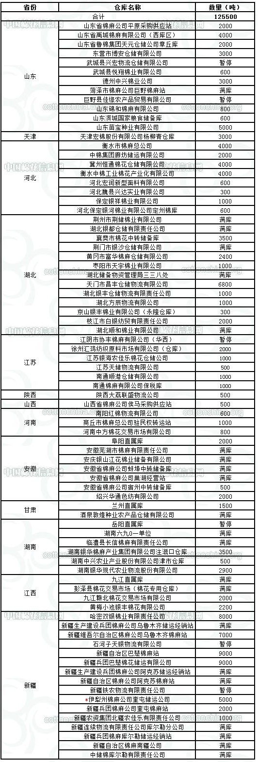 1月10日在以下指定倉庫收儲2011年度棉花125500噸。為解決兵團企業(yè)交儲困難問題,新疆部分庫點的單筆合同由400噸調(diào)整為5000噸(具體見帶*庫點)。