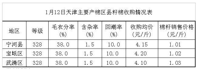 天津主要產(chǎn)棉區(qū)縣籽棉收購情況表(1月12日)
