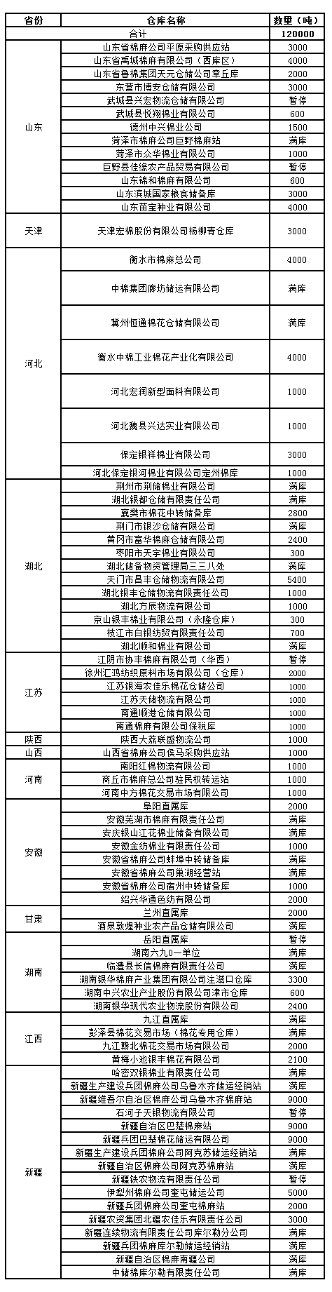 1月16日在以下指定倉(cāng)庫(kù)收儲(chǔ)2011年度棉花120000噸。