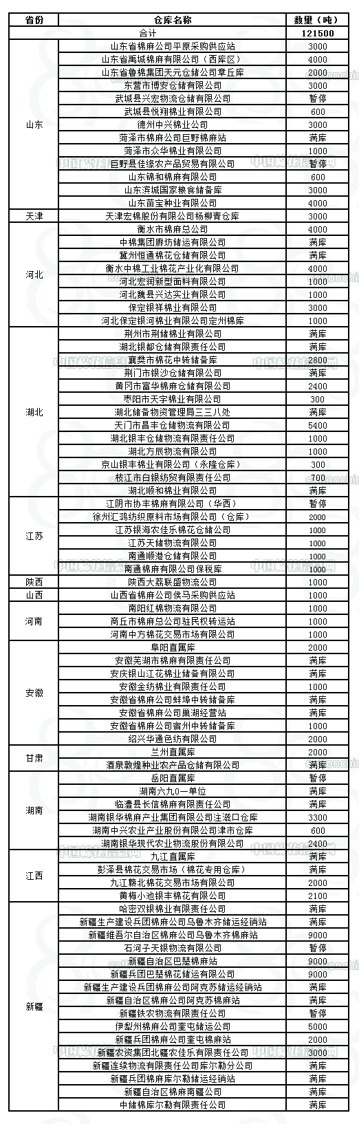 1月17日在以下指定倉庫收儲2011年度棉花121500噸。