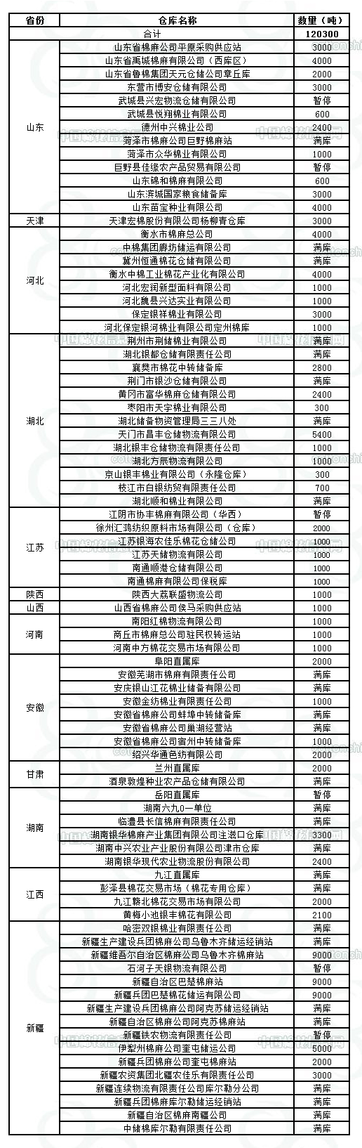 1月19日在以下指定倉庫收儲2011年度棉花120300噸。