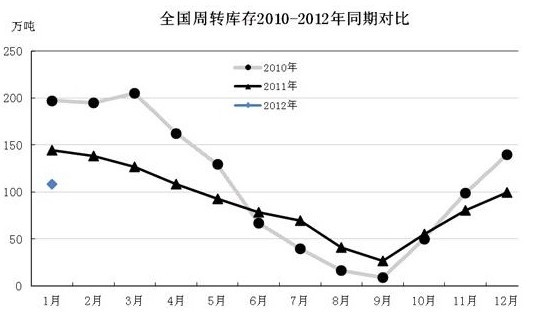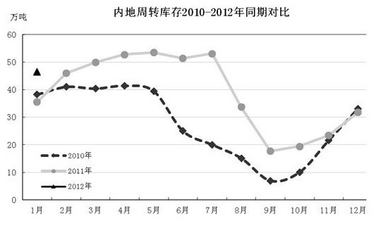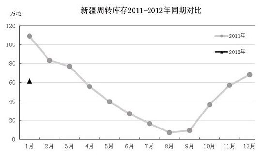 中國棉花協會棉花倉儲分會對120家倉儲會員單位統(tǒng)計,截至2012年1月底,商品棉周轉庫存總量為108.1萬噸(其中內地46.5萬噸、新疆61.6萬噸),環(huán)比增加8.4萬噸,同比減少36.3萬噸。據此推算,全國商品棉周轉庫存總量約為122.9萬噸,較上月增加11.7萬噸。當月,新疆21家中轉站點通過鐵路共向內地發(fā)運棉花18.1萬噸,環(huán)比增加0.3萬噸。