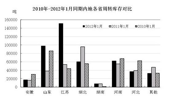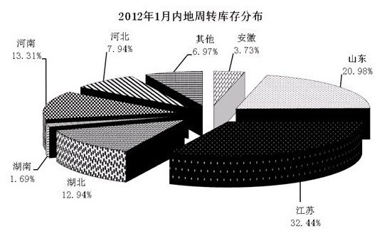 從當月內地庫存分布來看,江蘇庫存量仍為最大,接近全國1/3,其次是山東、河南和湖北。其中江蘇32%,較上月下降5個百分點;山東20%,較上月上升5個百分點;河南13%,較上月上升1個百分點;湖北12%,較上月上升2個百分點;安徽3%,較上月下降2個百分點;河北7%,較上月沒有變化。