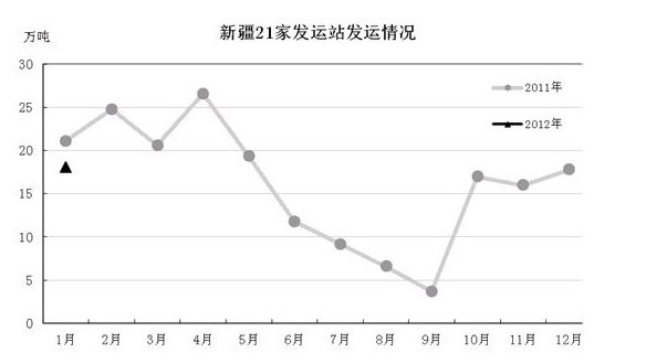 截至2011年1月底,新疆區(qū)內21家倉庫商品棉周(中)轉庫存為61.6萬噸(不含臨時收儲棉花),環(huán)比減少6.5萬噸,同比減少47.3萬噸。1月份以上中轉站共通過鐵路向內地發(fā)運棉花18.1萬噸,環(huán)比增加0.3萬噸,同比減少3萬噸。據此推算,1月底新疆棉在途量約4.2萬噸。