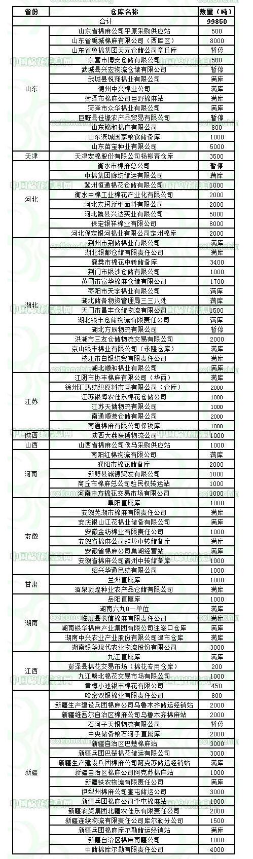 3月6日在以下指定倉(cāng)庫(kù)收儲(chǔ)2011年度棉花99850噸。