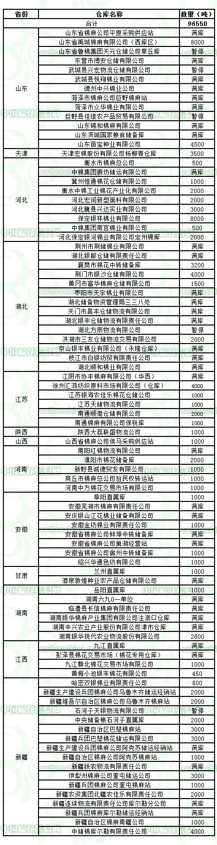 錦橋紡織網(wǎng)—資訊頻道> 棉花信息> 棉花動態(tài)>正文 3月7日收儲庫點(diǎn)及數(shù)量