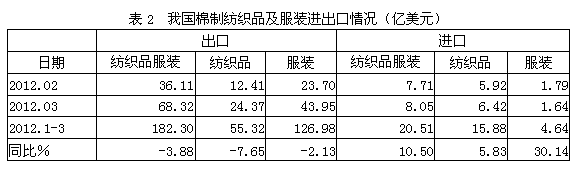 根據(jù)中國海關(guān)的統(tǒng)計數(shù)據(jù),我國2012年1-3月份棉制紡織品及服裝出口總額182.30億美元,同比減少3.88%,占紡織品及服裝出口總額515.68億美元的35.35%;其中1-3月份棉制紡織品出口總額55.32億美元,同比減少7.65%,占紡織品出口總額217.66億美元的25.42%;1-3月份棉制服裝出口總額126.98億美元,同比減少2.13%,占服裝出口總額298.02億美元的42.61%;