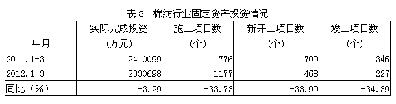 據(jù)國家統(tǒng)計局公布的數(shù)據(jù),2012年1-3月份棉紡行業(yè)實際完成投資額233.07億元,同比減少3.29%;當年以來到目前為止施工項目總數(shù)為1177個,同比減少33.73%;其中新開工項目數(shù)468個,同比減少33.99%;截至3月底為止,已實現(xiàn)竣工項目數(shù)227個,同比減少34.39%,占施工項目總數(shù)的19.29%,表明該行業(yè)投資項目進展較好。