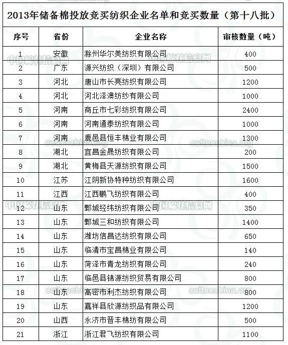 2013年儲(chǔ)備棉投放競(jìng)買紡織企業(yè)名單和競(jìng)買數(shù)量(第十八批)