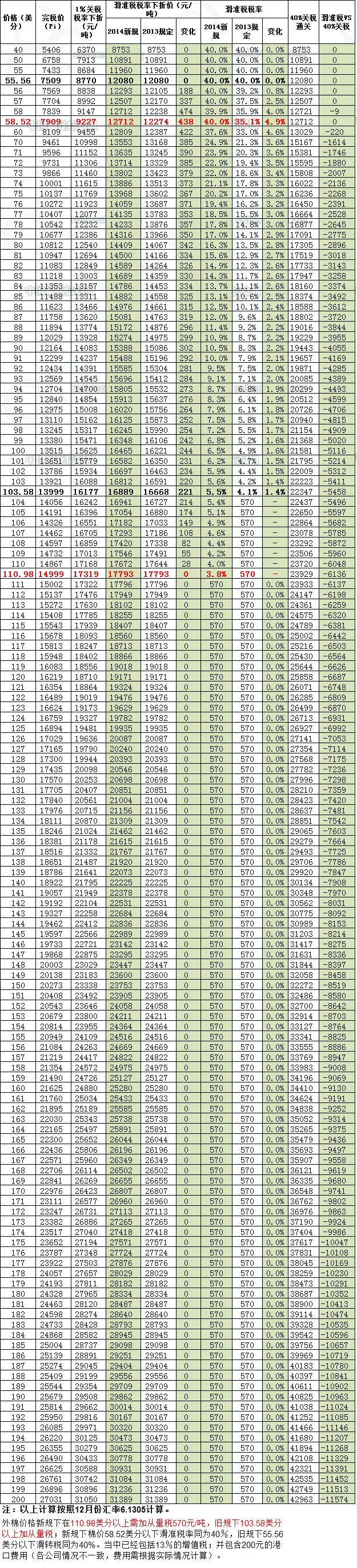 2014年新規(guī)下外棉報價1%稅率及滑準稅公式下折人民幣對照表