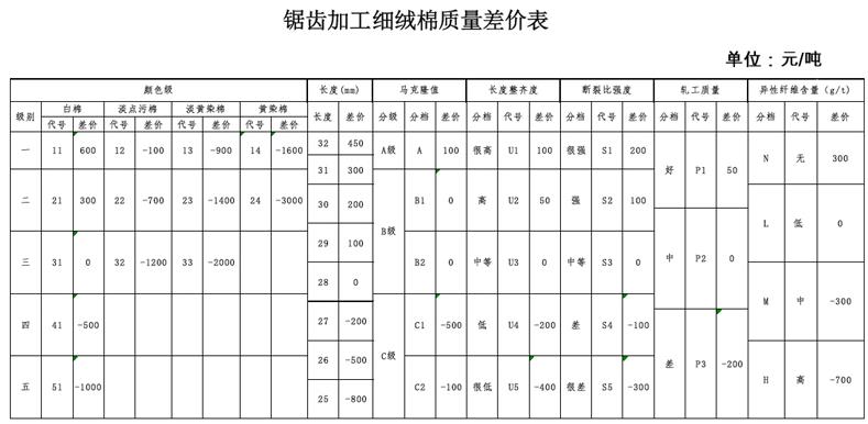 新修訂的棉花國家標(biāo)準(zhǔn)將于2013年9月1日起實施,有關(guān)部門制定關(guān)于國內(nèi)棉花貿(mào)易規(guī)則的《棉花買賣合同及一般條款》。對于新國標(biāo)和貿(mào)易條款對棉花市場及價格的影響眾說紛紜,根據(jù)湖南省某棉企去年加工皮棉的情況,對新國標(biāo)下湖南省棉花收儲和貿(mào)易形勢進行分析。 新國標(biāo)對其的不利影響 第一,新國標(biāo)的計價體系在很多方面維持新舊標(biāo)準(zhǔn)之間的相對穩(wěn)定,但湖南省達到交儲標(biāo)準(zhǔn)的皮棉比例將會下降。就湖南省棉花而言,顏色級與品級相比較折算出的價格基本相當(dāng)。去年上述棉企加工的皮棉4級占94.5%,5級占5.5%,按標(biāo)準(zhǔn)級皮棉328級收儲價格20400元/噸、4級等級差3%、5級等級差13%計算,加權(quán)平均價格19737元/噸。按顏色級來劃分去年上述棉企加工的皮棉中21級占0.03%,31級占9.85%,41級占20.88%,12級占0.47%,22級占54.91%,32級占13.83%,23級占0.03%。按標(biāo)準(zhǔn)級31級收儲價20400元/噸,根據(jù)《鋸齒加工細(xì)絨棉質(zhì)量差價表》(以下簡稱差價表,詳見附件),21、31、41、12、22、32、23級的等級差價分別300、0、-500、-100、-700、-1200、-1400元/噸計算,加權(quán)平均價格19744元/噸,較原品級標(biāo)準(zhǔn)結(jié)算價格提高7元/噸。對交儲而言,原國標(biāo)5級以下不能交儲,比例是5.5%,若新國標(biāo)32級以下不能交儲,比例達到13.86%,湖南省不符合交儲標(biāo)準(zhǔn)的棉花比例(僅指級別)將上升8.36%。 第二,新國標(biāo)對棉花長度的要求由原來的長度差價率改為固定級差,湖南省棉花的價格將隨之下降。去年上述棉企加工的皮棉長度30mm占1.41%、29mm占51.3%、28mm占46.42%、27mm占0.87%,按收儲價格20400元/噸,原品級標(biāo)準(zhǔn)長度結(jié)算是每毫米1%長度差價率,加權(quán)平均計算,長度差價是112元/噸,按顏色級結(jié)算價格體系,長度30mm、29mm、28mm、27mm、26mm的固定差價分別200、100、0、-200、-500元/噸,加權(quán)平均計算,長度差價52元/噸,較原品級結(jié)算體系計算的長度差價112元/噸減少60元/噸。 此外,軋工質(zhì)量作為計算棉花質(zhì)量差價的指標(biāo),南方空氣濕度大、籽棉水分較高,預(yù)計會出現(xiàn)部分加工質(zhì)量為“差”的棉花,同時湖南省棉花采摘交售過程中使用編織袋較多,異性纖維含量也會對棉花價格造成影響。 新國標(biāo)對其的有利影響 在標(biāo)準(zhǔn)級皮棉收儲價格不變的情況下,皮棉收儲價格總體將較去年有所提高,這主要依靠斷裂比強度和馬克隆值級。根據(jù)差價表,斷裂比強度S1、S2、S3、S4、S5級等級差價分別200、100、0、-100、-300元/噸,湖南省皮棉斷裂比強度均在S3級以上,在結(jié)價時價格將相應(yīng)提高。以上述棉企去年加工的皮棉為例,S1占8.5%,S2占51.7%,S3占39.7%,S4占0.1%,加權(quán)平均計算,斷裂比強度加價69元/噸。另外,新國標(biāo)差價表規(guī)定,馬克隆值A(chǔ)、B1、B2、C2、C1級差價分別100、0、0、-100、-500元/噸,去年上述棉企加工的皮棉中馬克隆值A(chǔ)級占57.4%、B1級占11.0%、B2級占25.9%、C2級占1.7%、C1級占4.0%,加權(quán)平均計算,馬克隆值級加價35元/噸。需要說明的是,正常年景湖南省棉花馬克隆值以C2級居多,去年是1個特例,由于采摘期雨水偏多、光照偏少,中后期棉花成熟度普遍不夠,導(dǎo)致馬克隆值偏小,出現(xiàn)較多的A級。 長度整齊度指標(biāo)對棉花價格影響不大。按新國標(biāo)差價表,長度整齊度U1、U2、U3、U4、U5,差價分別100、50、0、-200、-400元/噸,去年上述棉企加工的皮棉長度整齊度U2檔占15.9%、U3檔占83.4%、U4占0.70%,加權(quán)平均計算,長度整齊度指標(biāo)加價7元/噸,主要原因是正常年份湖南省棉花長度整齊度以U3檔為主,交儲沒有差價。 綜上所述,新國標(biāo)差價表顏色級、長度、軋工質(zhì)量、馬克隆值、斷裂比強度、長度整齊度、異性纖維7個品級檢驗指標(biāo),剔除去年未單獨公檢的軋工質(zhì)量和異性纖維,去年上述棉企加工的皮棉按品級檢驗(以標(biāo)準(zhǔn)級20400元/噸計算),加權(quán)平均價格19849元/噸(未考慮馬克隆值),按新國標(biāo)顏色級檢驗的加權(quán)平均價格19907元/噸,顏色級較品級結(jié)算價格提高58元/噸。但據(jù)了解,這一指標(biāo)提高的幅度低于全國平均水平,如何提高棉花質(zhì)量進而提高效益將是湖南棉企需要研究的重要課題。據(jù)悉,近期中國儲備棉管理總公司將出臺關(guān)于2013年度收儲棉花等級及質(zhì)量差價的細(xì)則,對部分等級的棉花差價進行調(diào)整,相信調(diào)整后的細(xì)則將更有利于棉企交儲。