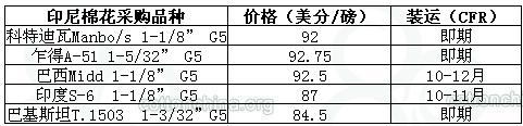 孟加拉國(guó)紡企近期采購(gòu)主要為津巴布韋SMFull 1-1/8"棉花,馬克隆值3.8-4.9,29GPT,10月裝運(yùn)CFR價(jià)格93美分/磅;土庫(kù)曼斯坦GM 1-1/8"棉花,馬克隆值4-4.9,29GPT,10/11月裝運(yùn)價(jià)格94美分/磅;印度S-6有機(jī)棉,29mm,馬克隆值3.7-4.9,29GPT,10月裝運(yùn)價(jià)格95.5美分/磅;巴基斯坦Type 1503新花1-3/32",馬克隆值4-4.9,28GPT,即期裝運(yùn)價(jià)格86美分/磅。 不少孟加拉國(guó)紡企采購(gòu)需求基于10月底,主要為澳棉、烏茲別克棉和土庫(kù)曼棉,此外當(dāng)?shù)丶徠筮€向非洲棉、印度S-6、MCU-5及巴基斯坦Type 1503棉花發(fā)出詢盤。 盡管印尼當(dāng)?shù)刎泿沤趨R率震蕩,紡企詢盤仍持續(xù)針對(duì)即期需求,11日當(dāng)?shù)孛藁ǔ山涣坑邢蓿诓少?gòu)情況見下表: