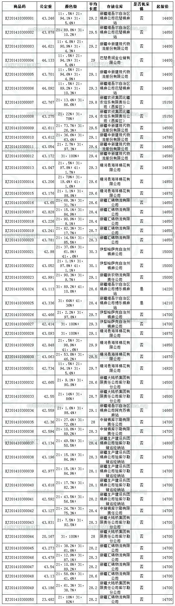 各交易商: 定于10月30日推出新疆棉競賣資源2115.867噸。其中,手摘棉2029.418噸,最低起報價14400元/噸,最高起報價15150元/噸;機采棉86.449噸,最低起報價14210元/噸,最高起報價14220元/噸。相關(guān)詳細數(shù)據(jù)見附件。具體庫點如下:
