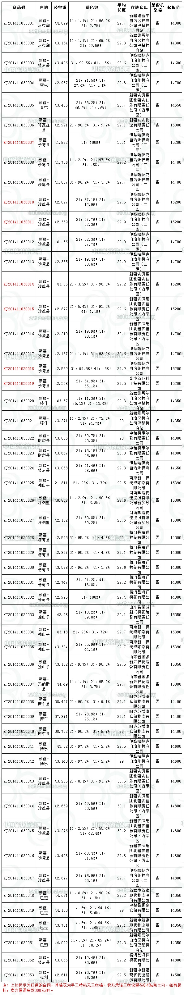 各交易商: 定于11月3日推出新疆棉競賣資源2242.765噸,全為手摘棉。其中新疆庫資源量為1920.818噸(最低起報價14300元/噸),內(nèi)地庫資源量為321.947噸(最低起報價為15300元/噸)。當(dāng)日總競賣資源中有7批手工特挑無三絲棉(最低起報價15200元/噸)。賣方承諾三絲含量在0.4‰克之內(nèi)。如有超標(biāo),賣方愿退貨款300元/噸。相關(guān)詳細(xì)數(shù)據(jù)見附件。具體庫點如下: