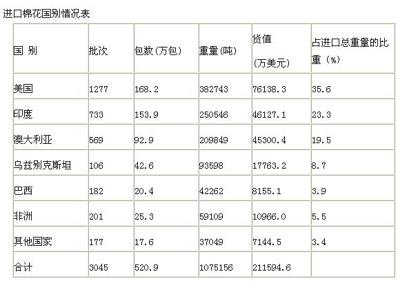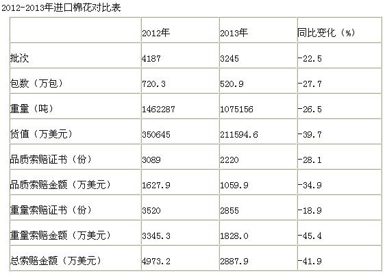 一、基本情況 1、2013年,江蘇檢驗(yàn)檢疫局共檢驗(yàn)進(jìn)口棉花3245批,520.9萬包,1075156噸,貨值共計211594.6萬美元,經(jīng)檢驗(yàn)對外出具品質(zhì)索賠證書2220份,品質(zhì)索賠金額為1059.9萬美元,對外出具重量索賠證書2855份,重量索賠金額為1828.0萬美元,對外索賠總金額共計為2887.9萬美元,占進(jìn)口總貨值的1.37%,為國家和用棉企業(yè)挽回了巨大的經(jīng)濟(jì)損失。 2013年江蘇地區(qū)進(jìn)口棉花來自世界各地31個國家和地區(qū),主要有美國、印度、烏茲別克斯坦、澳大利亞、巴西和非洲等,其中以美棉和印度棉為主體,分別占進(jìn)口的35.6%和23.3%。澳大利亞棉占19.5%,烏茲別克斯坦棉占8.7%,巴西棉占3.93%,非洲棉花占5.50%,其他國家棉占3.45%,具體可參照表1。 SM,M等級為2013年進(jìn)口棉花的主體等級,其中,SM級及其以上的棉花約占進(jìn)口總批次量的28.1%,M級及其以上的棉花約占進(jìn)口總批次量的48.8%,另外,憑樣成交的棉花約占32.0%。進(jìn)口貿(mào)易方式包括一般貿(mào)易、來料加工、進(jìn)料加工等。 2、與2012年進(jìn)口棉花數(shù)據(jù)對比 與2012年相比,2013年江蘇地區(qū)進(jìn)口棉花量較去年有所降低,其中批次降低22.5%,件數(shù)和重量分別降低27.7%和26.5%,貨值則減少39.7%,具體情況見表2。