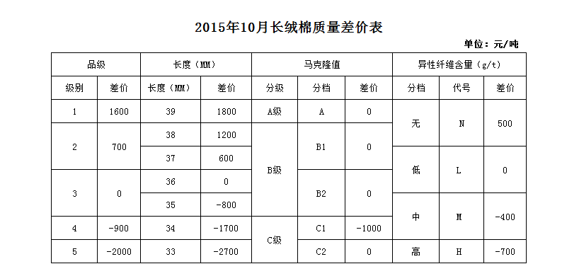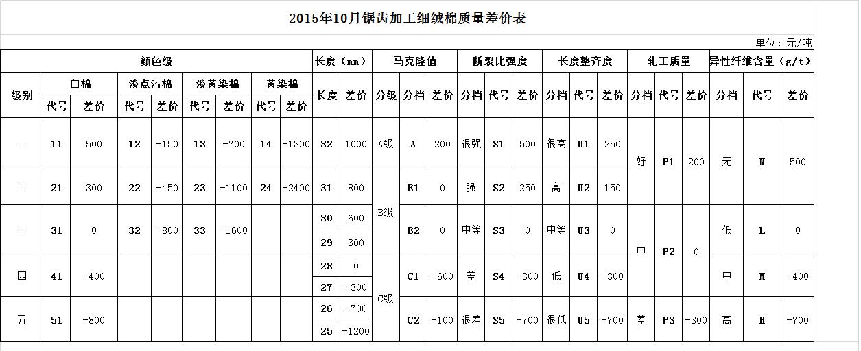 2015年10月《中國棉花協(xié)會國產(chǎn)棉質(zhì)量差價表》保持不變,各指標(biāo)價差幅度維持9月份水平。
