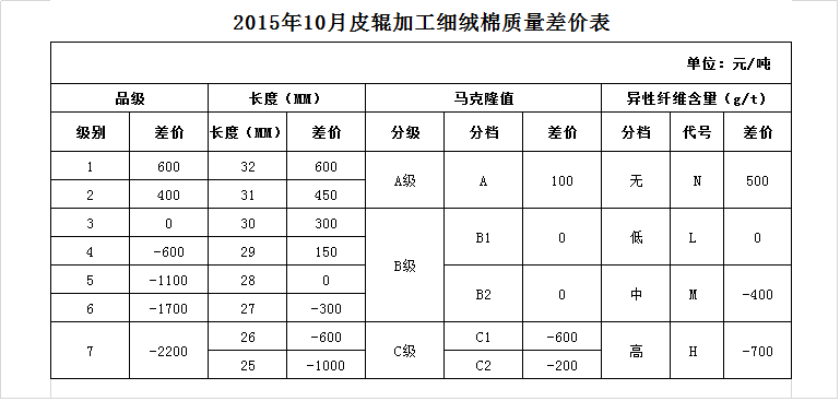 2015年10月《中國棉花協(xié)會國產(chǎn)棉質(zhì)量差價表》