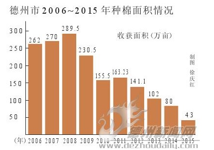 德州市農(nóng)業(yè)局棉技站站長張振興做了一個統(tǒng)計,如今的種棉面積還不到10年前的零頭。“2005年是251萬畝,2008年是289.5萬畝,2013年僅有102萬畝,2014年降至80萬畝,2015年,棉花種植面積僅為43萬畝,是近10年來面積最少的一年。”張振興說。