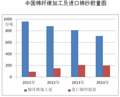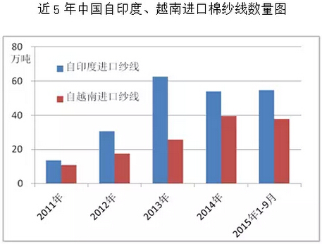 亞洲是全球棉花消費增長的主要地區(qū),其中印度、越南、印度尼西亞、孟加拉國等國家都表現(xiàn)出不同程度地增長。其中重要原因之一是,中國進口紗線數(shù)量的增長替代了部分國內(nèi)棉紡織企業(yè)對棉花的直接消費,拉動了棉花消費增長。根據(jù)海關(guān)數(shù)據(jù)顯示,2012~2014年期間,中國年均進口棉紗線約190萬噸,2015年1-9月累計進口數(shù)量同比增長24.4%,預(yù)計短期內(nèi)大量進口棉紗的局面或?qū)⒕S持一段時期。