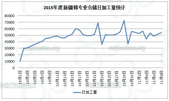 根據(jù)全國棉花交易市場新疆棉花專業(yè)倉儲(chǔ)進(jìn)度表最新統(tǒng)計(jì),截至11月8日0時(shí),累計(jì)加工量已達(dá)到202.76萬噸(地方125.11萬噸,兵團(tuán)77.65萬噸)。進(jìn)入11月份以來,加工量日均維持在5萬噸以上。