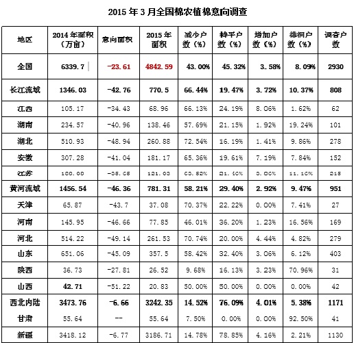 被調(diào)查的2930戶棉農(nóng)中,準(zhǔn)備減少植棉面積的棉農(nóng)占43%,準(zhǔn)備增加的棉農(nóng)占3.58%,與上年持平的占45.32%,尚在徘徊的占8.09%。與上月相比,徘徊戶因播種在即有所下降,多數(shù)轉(zhuǎn)為減少戶,持平戶,少數(shù)轉(zhuǎn)為增加。按照被調(diào)查棉農(nóng)植棉意向加權(quán)平均計算,全國棉農(nóng)平均種植意向減少23.61%,減幅較上月減少0.61個百分點(diǎn),以協(xié)會2014年面積為基數(shù),預(yù)計2015年全國植棉面積4842.6萬畝。